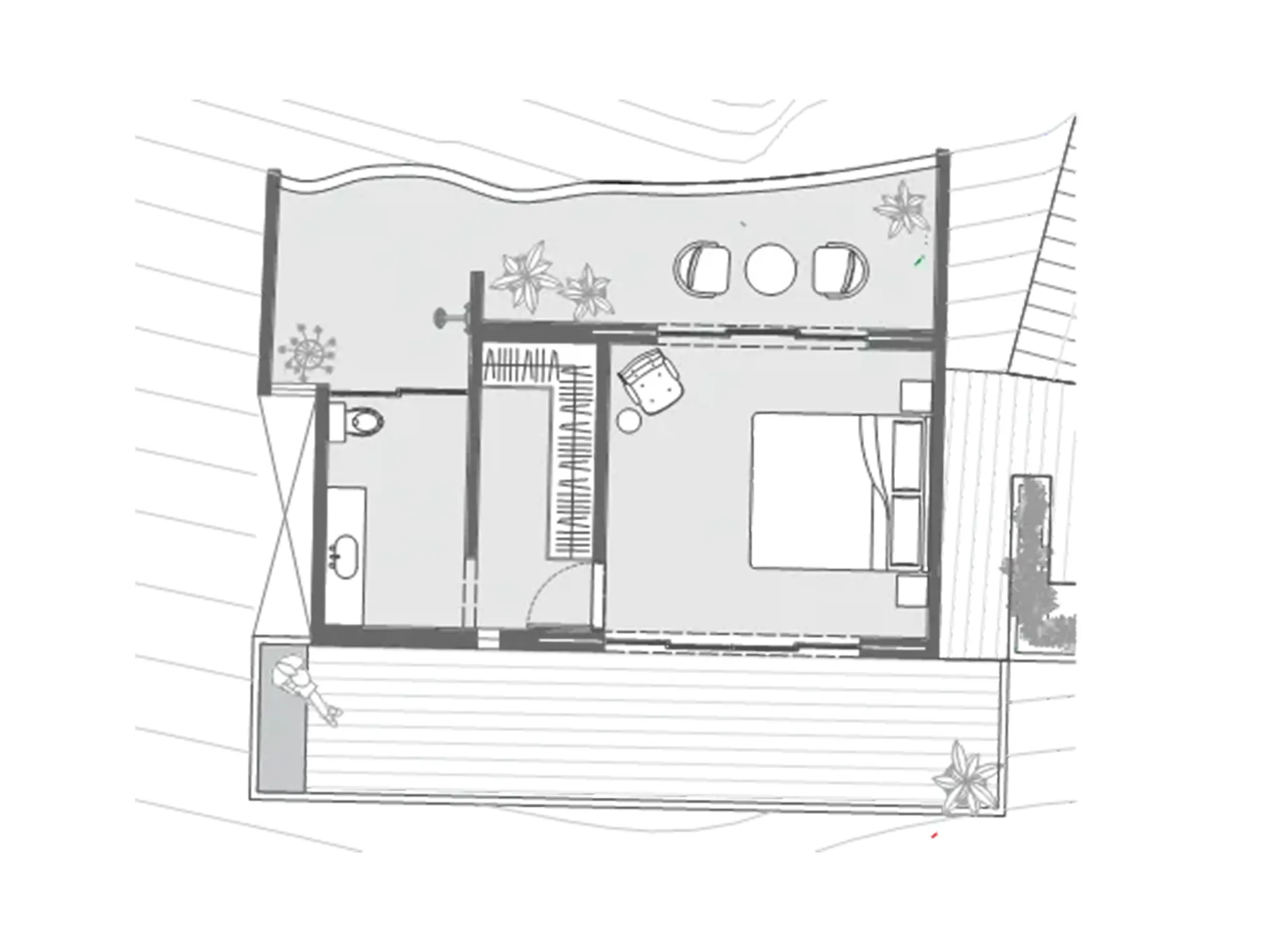 El nombre de esta habitación, San Pedro, honra a los cactus que como guardianes silenciosos acompañan y protegen su entrada. Envuelta por la fuerza del cerro y abierta al horizonte del mar, esta habitación te conecta con una energía profunda.